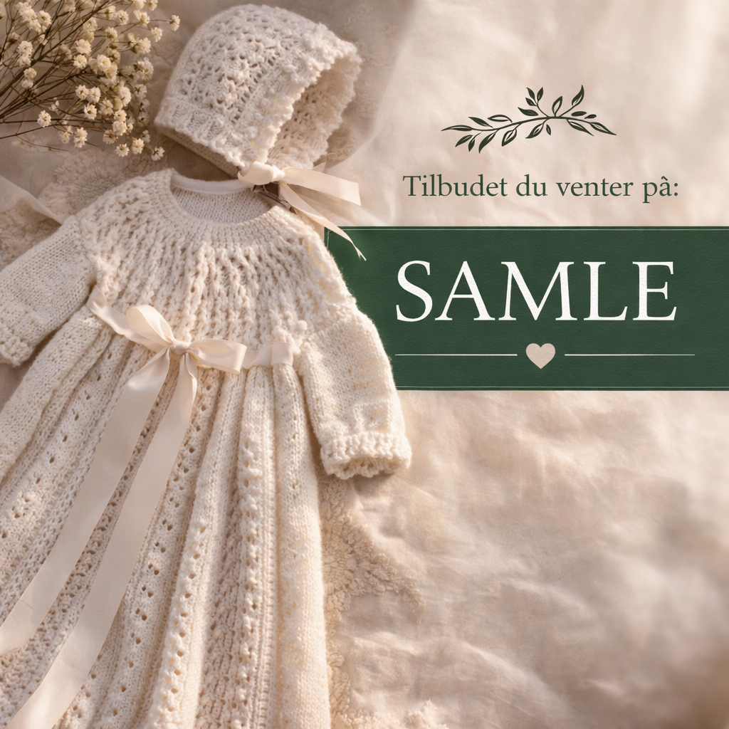 Håndlaget dåpskjole med tilhørende lue, strikket på bestilling etter dine ønsker.Et unikt plagg som foreviger en av livets største dager – et minne for livet. Hver dåpskjole lages på bestilling –med tid, omtanke og ekte håndverk.